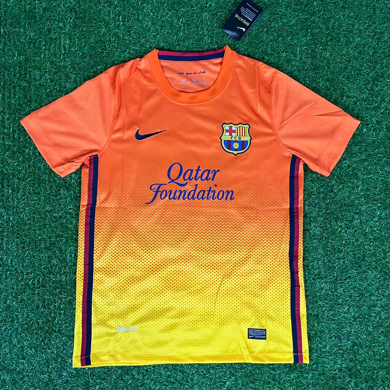 Deutsch: Erleben Sie die Saison 2012/13 des FC Barcelona mit dem Retro-Trikot #10 von Lionel Messi in Orange noch einmal. Dieses leuchtende Trikot verewigt die Magie eines der größten Fußballspieler der Geschichte und unterstreicht sein außergewöhnliches Talent während einer dominanten Saison in der Liga.