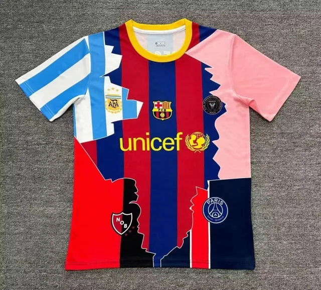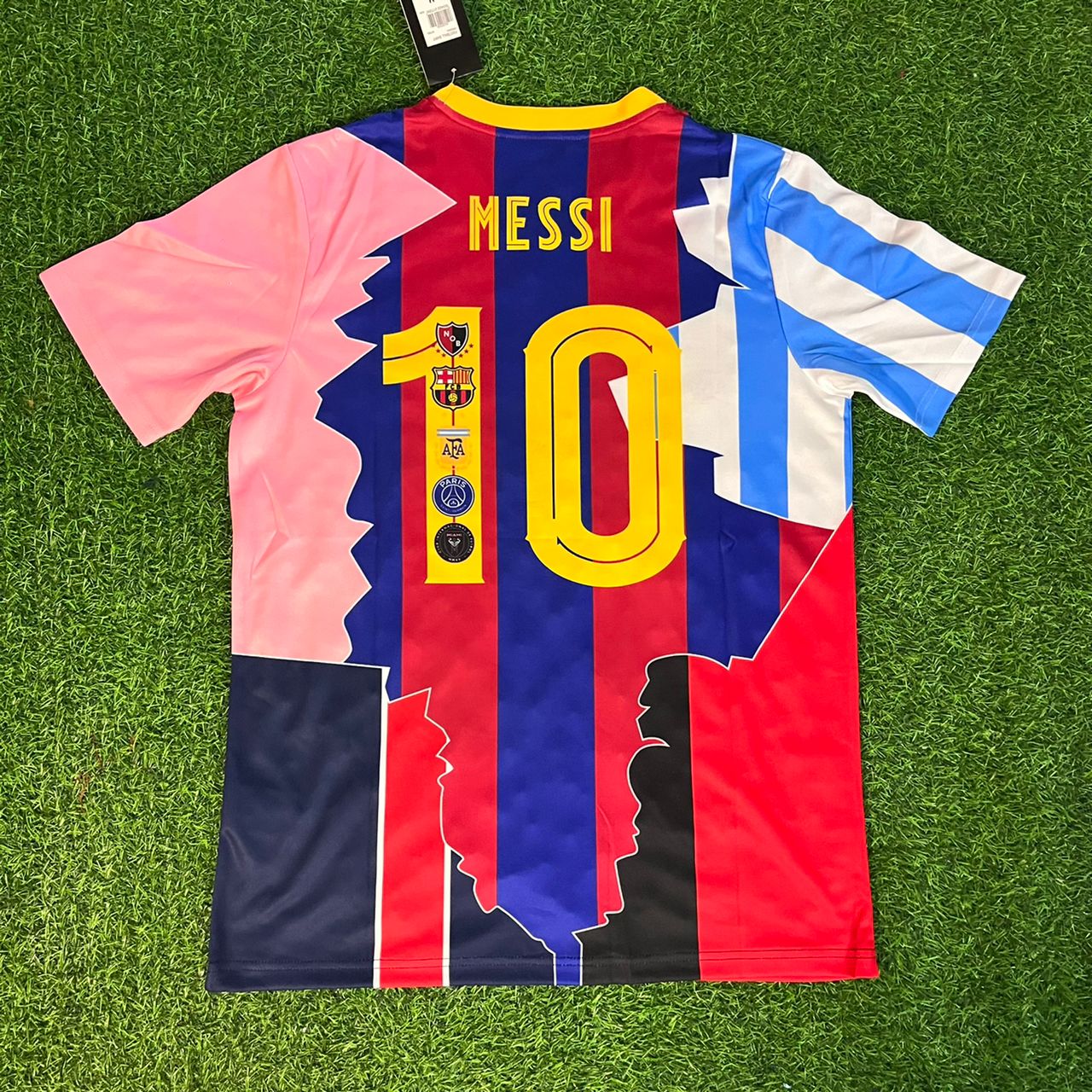 Celebrate the career of the greatest footballer of all time with the Lionel Messi GOAT Combo All Teams Special Jersey. This jersey features a tribute to Messi's incredible journey with all the clubs he’s played for, from Barcelona to PSG and Argentina, showcasing his legacy across the world.
