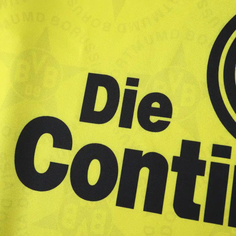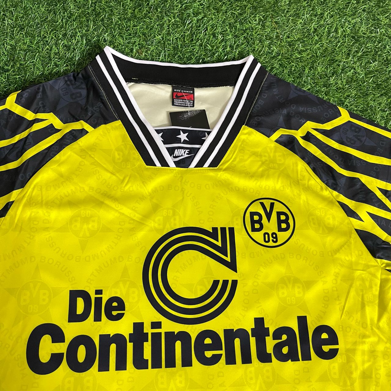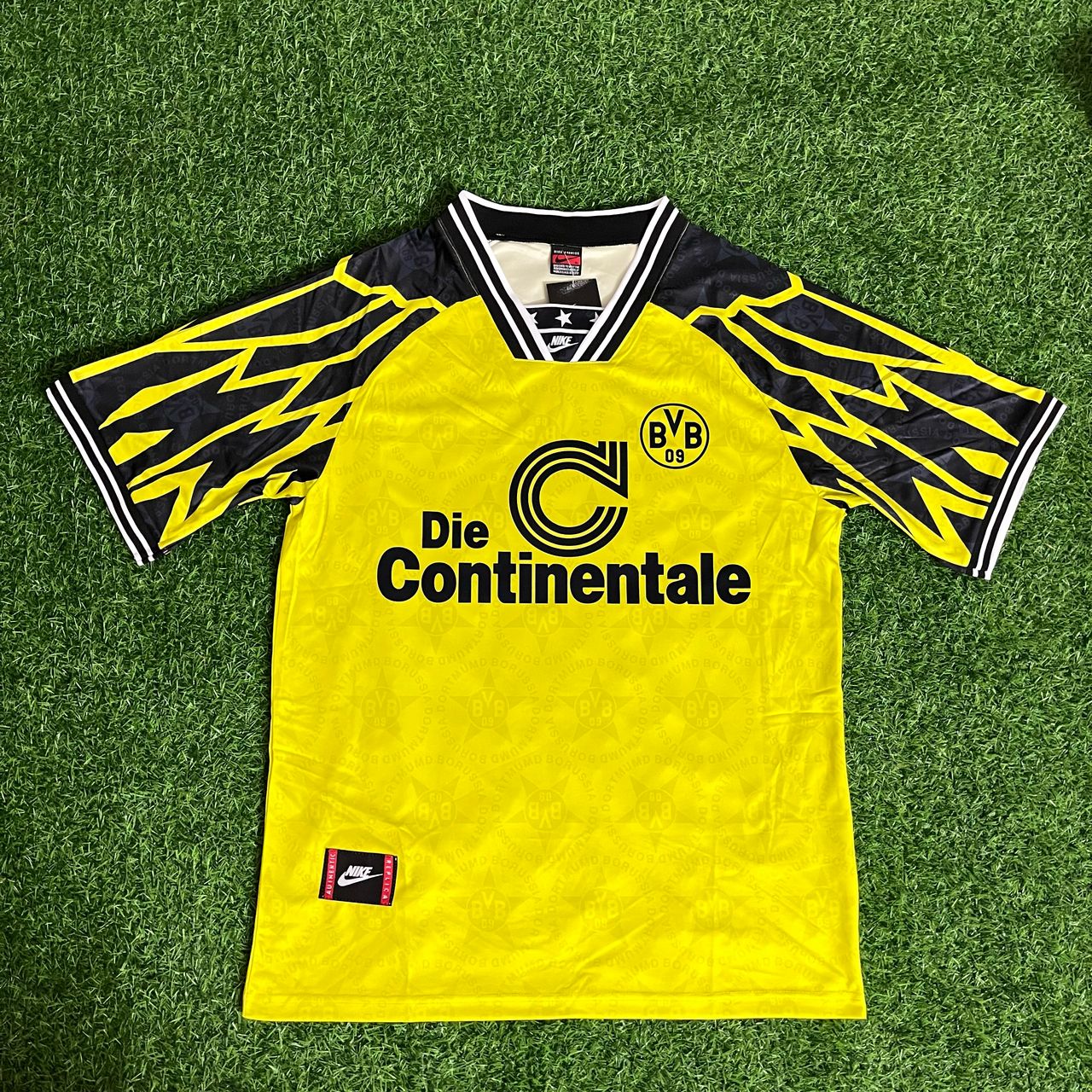 English: Step into the rich football history of Borussia Dortmund with this iconic 1994-1995 home jersey. Reminiscent of the legendary generation featuring stars like Matthias Sammer, Michael Zorc, and Andreas Möller, this jersey captures the spirit of an incredible period in BVB's history. Tapping into the era when these midfield maestros and goal-scorers defined German football, the shirt connects fans to a time of passion, tactical brilliance, and unforgettable performances. Perfect for supporters who remember the magic of Borussia Dortmund's most dynamic footballing generation.