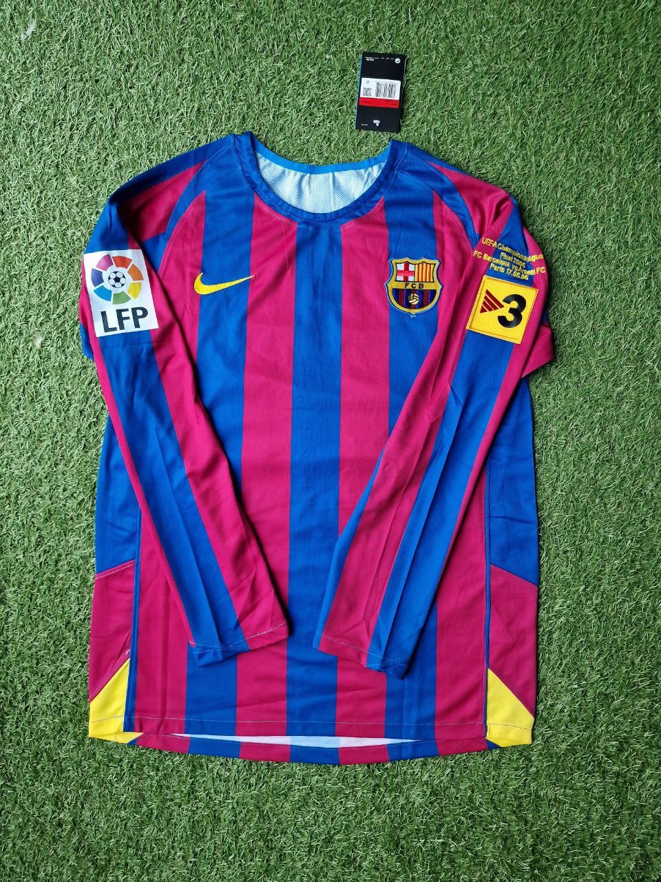 Relive one of the greatest moments in football history with the Ronaldinho Gaucho Barcelona 2006 Paris Final vs Arsenal Retro Long Sleeve Football Jersey. This jersey commemorates Ronaldinho's iconic performance in the 2006 UEFA Champions League Final, where he helped secure Barcelona’s victory over Arsenal with a stunning performance.